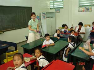 Canadian teacher's assistant helps out a local teacher in one of the elementary school classes. |